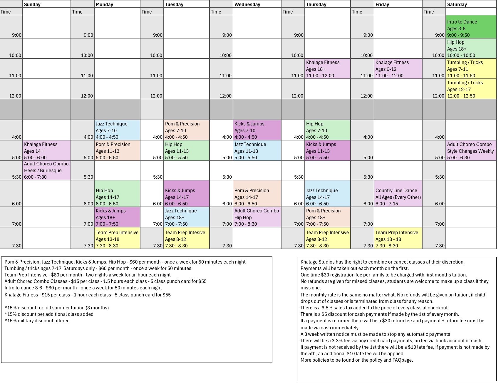 Classes offered : Pom, Kick, Hip Hop, Jazz, Tumbling, Fitness,